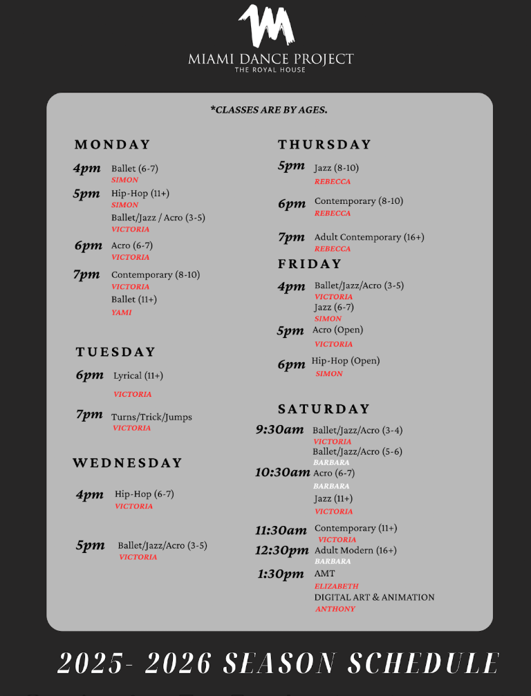 Posted on Katiuska Chipoco Miami Dance Project, it is not only a dance studio is a place where you find a second family. Their teachers, staff and director are amazing, full of knowledge and kindness towards the students.Posted on Christina Leon MDP is an outstanding community based program that helps a diverse profile of young individuals in Miami. Highly recommend this program if you are looking for success and structured growth for your child.Posted on Yaima Mendez Miami Dance Project is very professional, they focus on every student to be the best version of themself. I recommend this studio 100%. They are one of the best Dance Studios in Miami. ?Posted on Kara Keasling Fantastic dance as well as music classes (piano and voice lessons) for creating well rounded talent in all areas of art in a friendly environment! The kids were all saying goodbye to each other even in the parking lot, one kid was hiding from his Mom because he didn't want to leave class yesterday!Posted on Frank Silva I have had my daughter at Miami Dance Project for over two years, and I have seen such an amazing transformation in her general development and personality…it is truly amazing. My little one is growing confident each day with an enthusiastic and passionate love for dance! From ballet, to modern dance, and even tap dance! Phenomenal studio, staff, and a healthy family atmosphere. Highly recommended to all my friends, family, and colleagues. Thank You MDP for all you do!! ? ??Posted on Giancarlo Chipoco Wow! So Happy I found this place. We tried a couple of Ballet schools for my 4 year old daughter. She was not too into it. But things changed from the first day she started at Miami Dance Project. They also teach piano and vocal lessons. I am amazed at how much she’s picked up. My daughter dances all around the house now. So fun to watch her learn. She loves her teachers. We drive all the way from Homestead. The professors and dance teachers are amazing!Posted on Roberto Dias I am very grateful to be part of the Miami Dance Project family and to be able to see step by step the evolution of my students. I am completely proud of all of you.Posted on Pedro Diaz Miami Dance Project is more than a dance studio. It is a place that promotes respect and exemplifies discipline, determination, persistence, and love for the Arts. As a father of a young dancer I could not be happier that she is part of Miami Dance Project.Posted on Tina Cure My 2 daughters love Miami Dance Project. They have been going there for more than 5 years now. MDP feels more like a dance studio to them. It is not only a studio where they learn great technique in all genres, but also it is a place where they can express themselves, make good friends, learn how to work in a team, and have fun. The studio and their methodology also helps them to develop great virtues like discipline, dedication and resilience. My girls love their MDP family.Posted on Sylvia Padron Miami Dance Project provides quality Dance training in diverse Dance styles. Teachers work well with different levels. Staff is caring and patient. Their outreach program makes Dance accessible to students who receive little to no exposure to the Arts. Miami Dance Project staff doesn't just teach "Dance". Miami Dance Project teaches students about commitment, citizenship, resilience, self-motivation, Teamwork and family.Google rating score: 4.9 of 5, based on 34 reviews